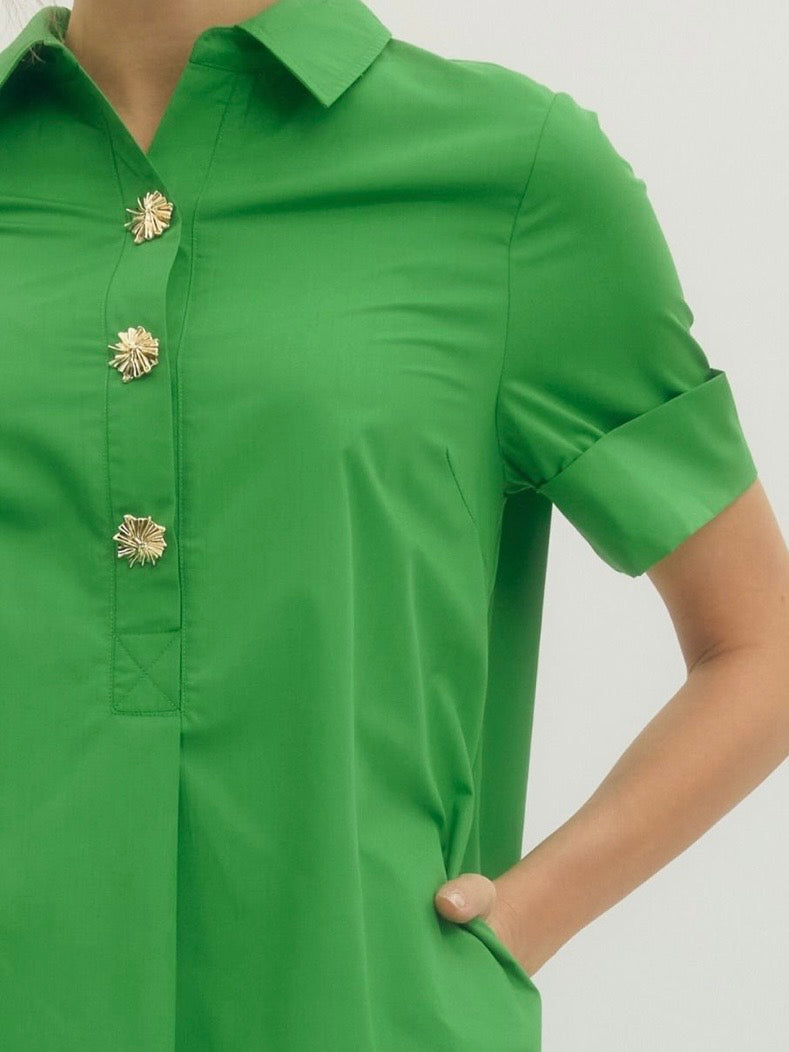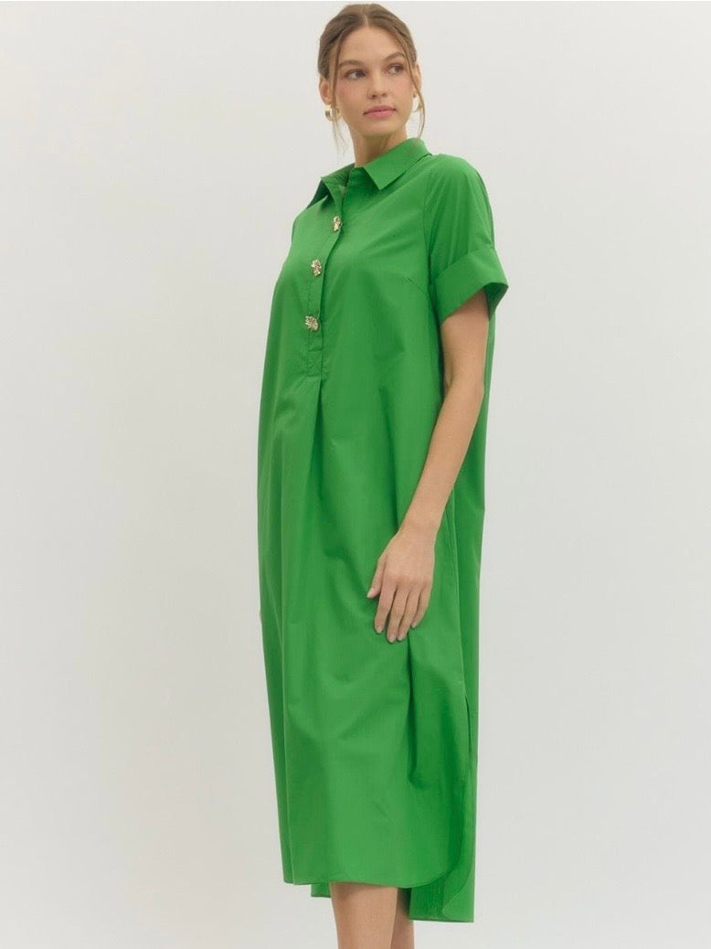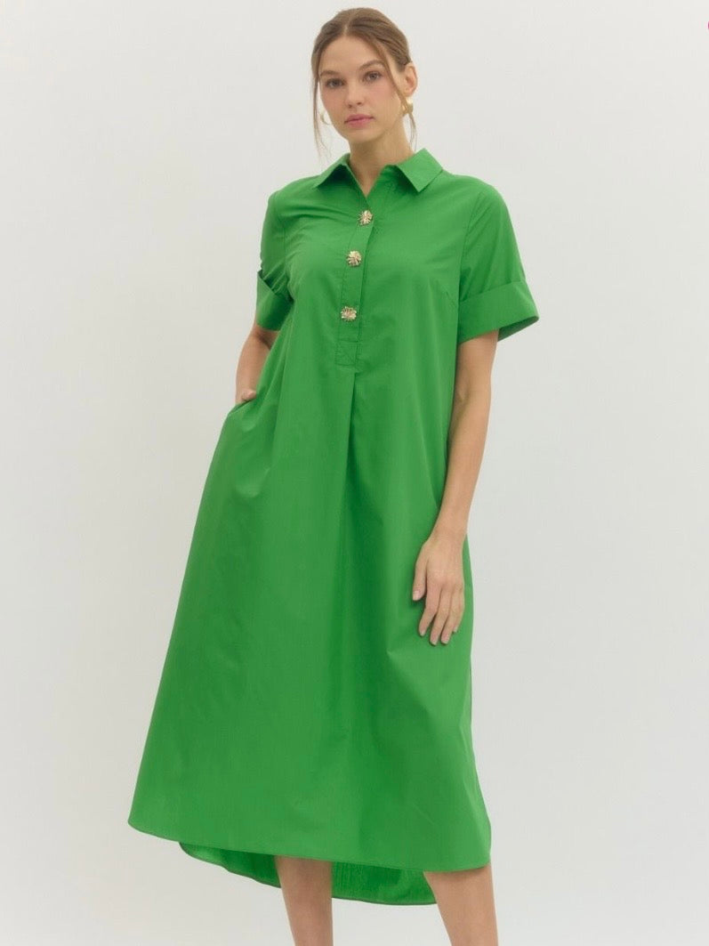 Green midi short sleeve dress featuring gold buttons and side pockets.
