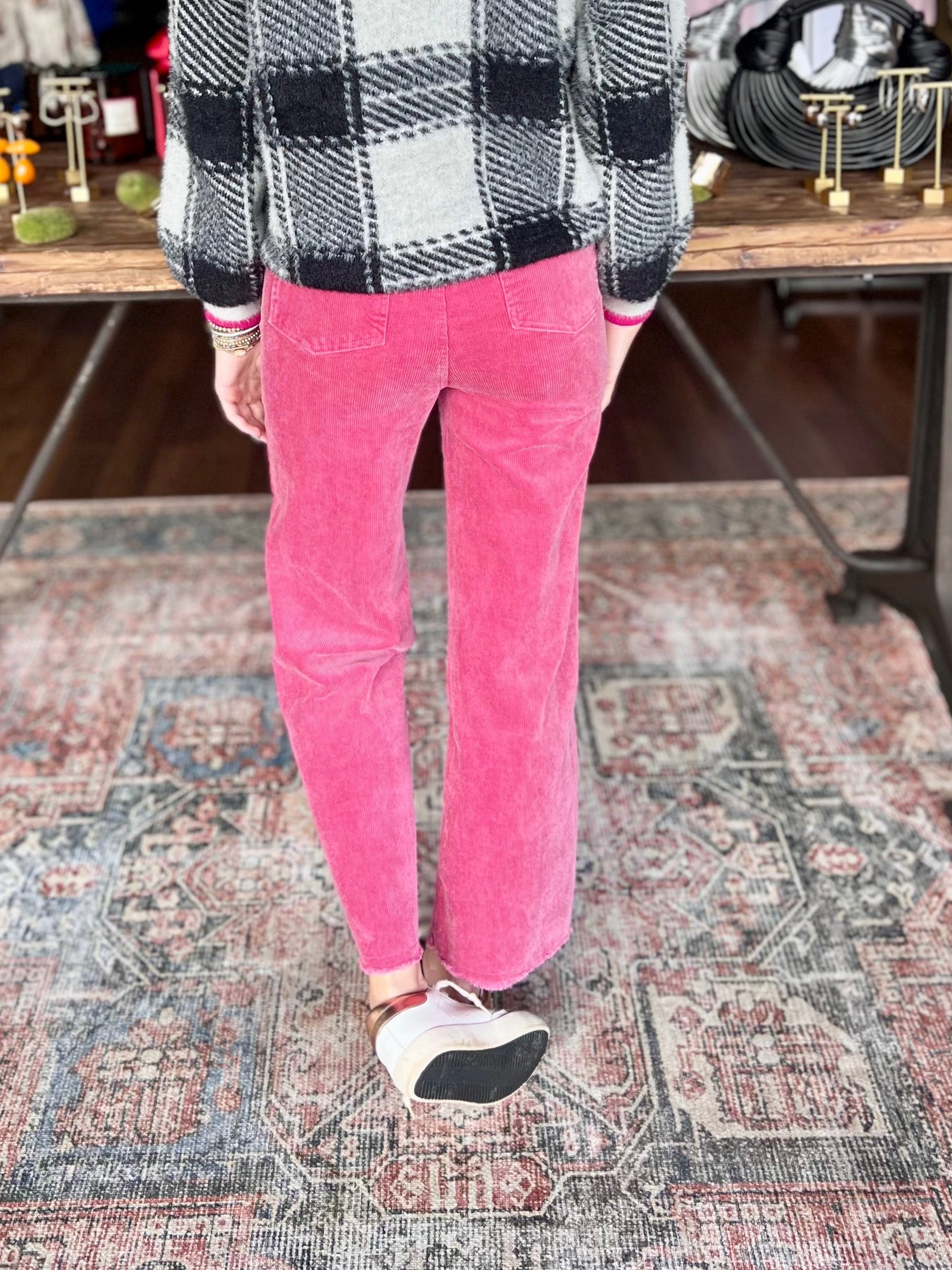 Mineral washed raw edge hemline corduroy pants.