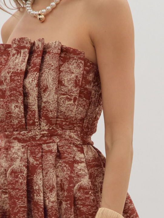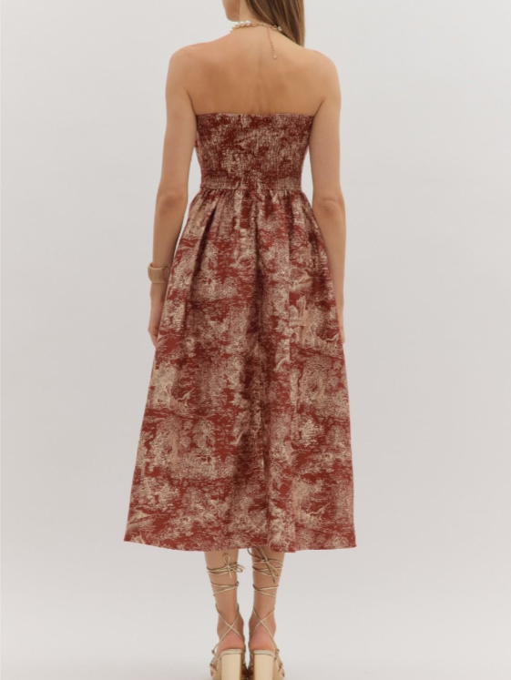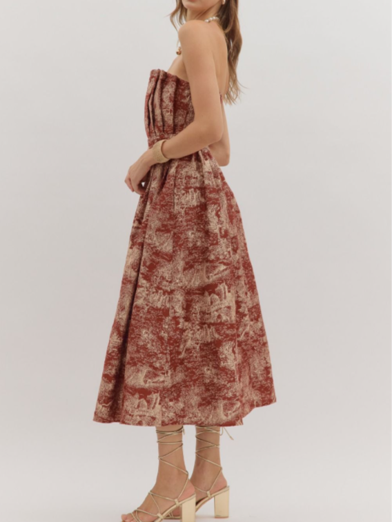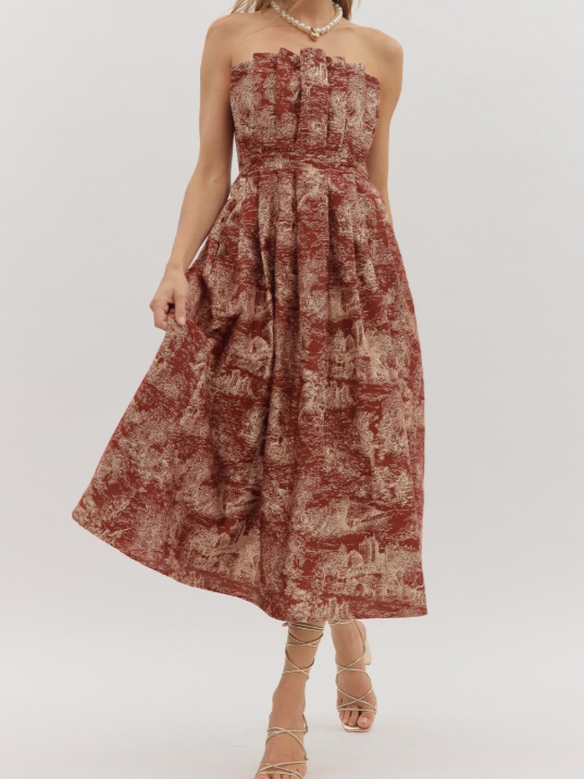 GORGEOUS burgundy strapless crumb catcher midi dress featuring ruched back and side pockets.