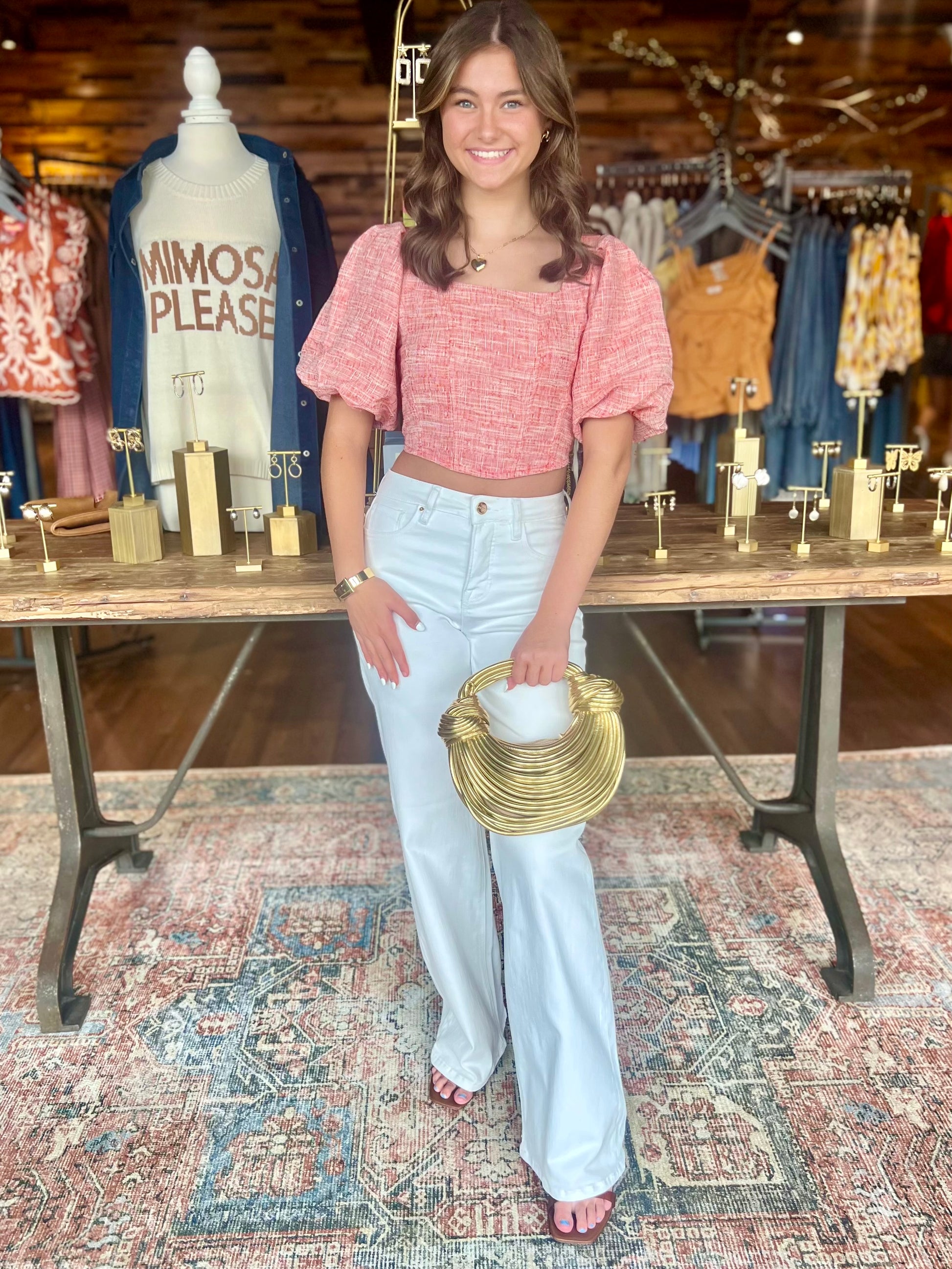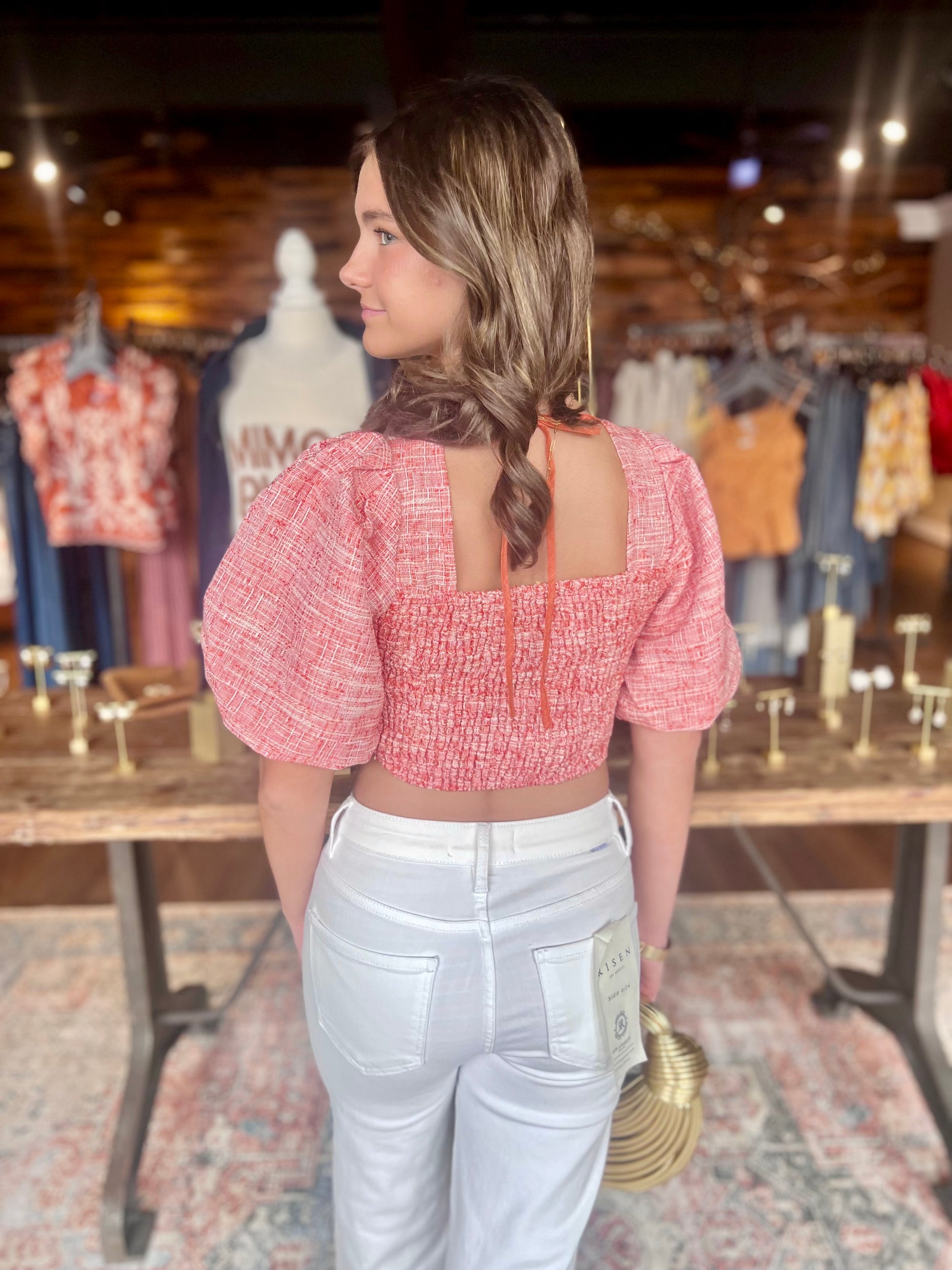 Adorable puff sleeve tie back crop top.