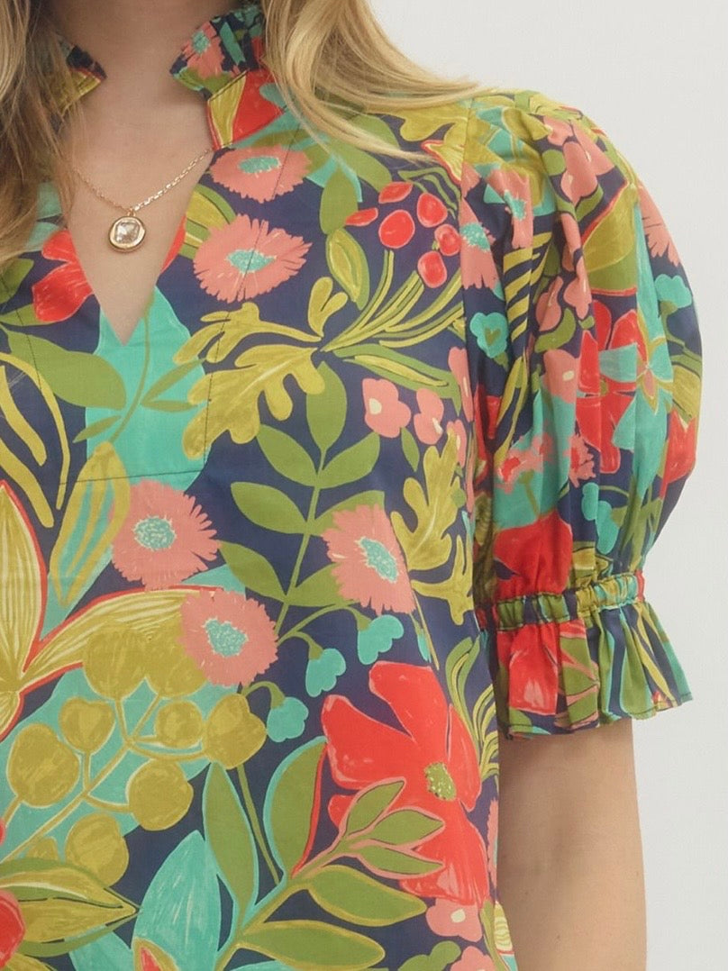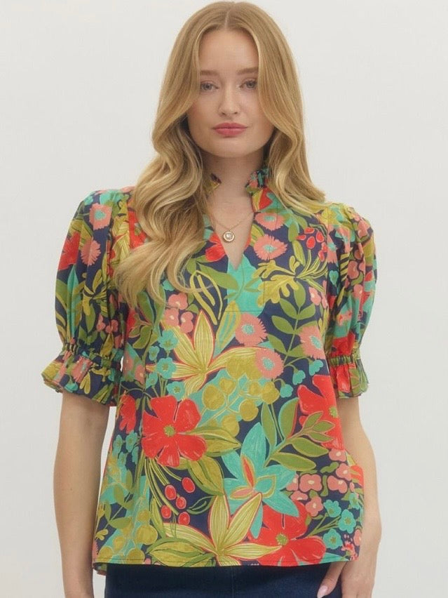 Bold print short sleeve blouse featuring ruffle sleeve and neckline.