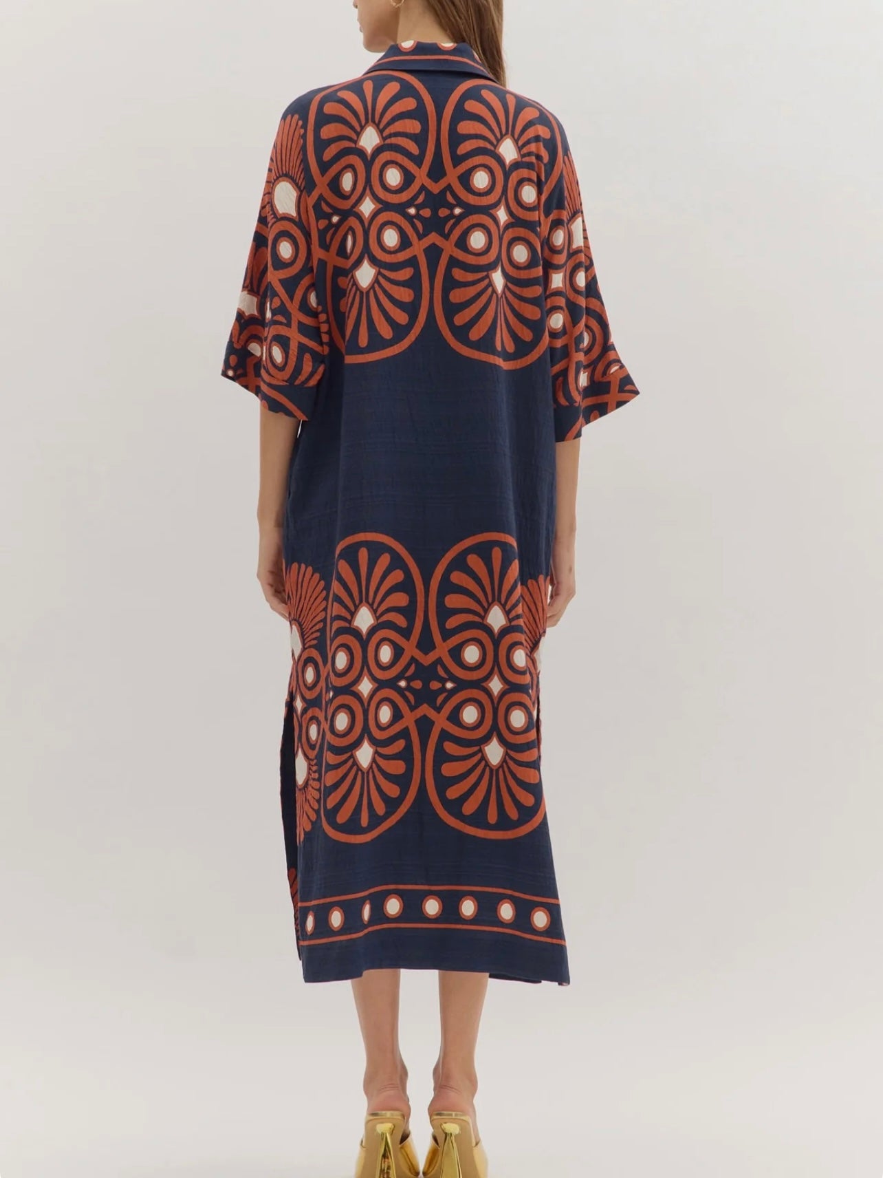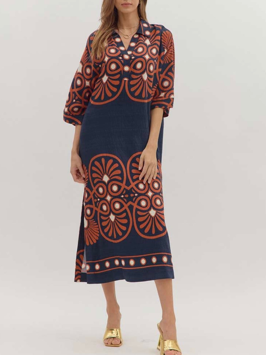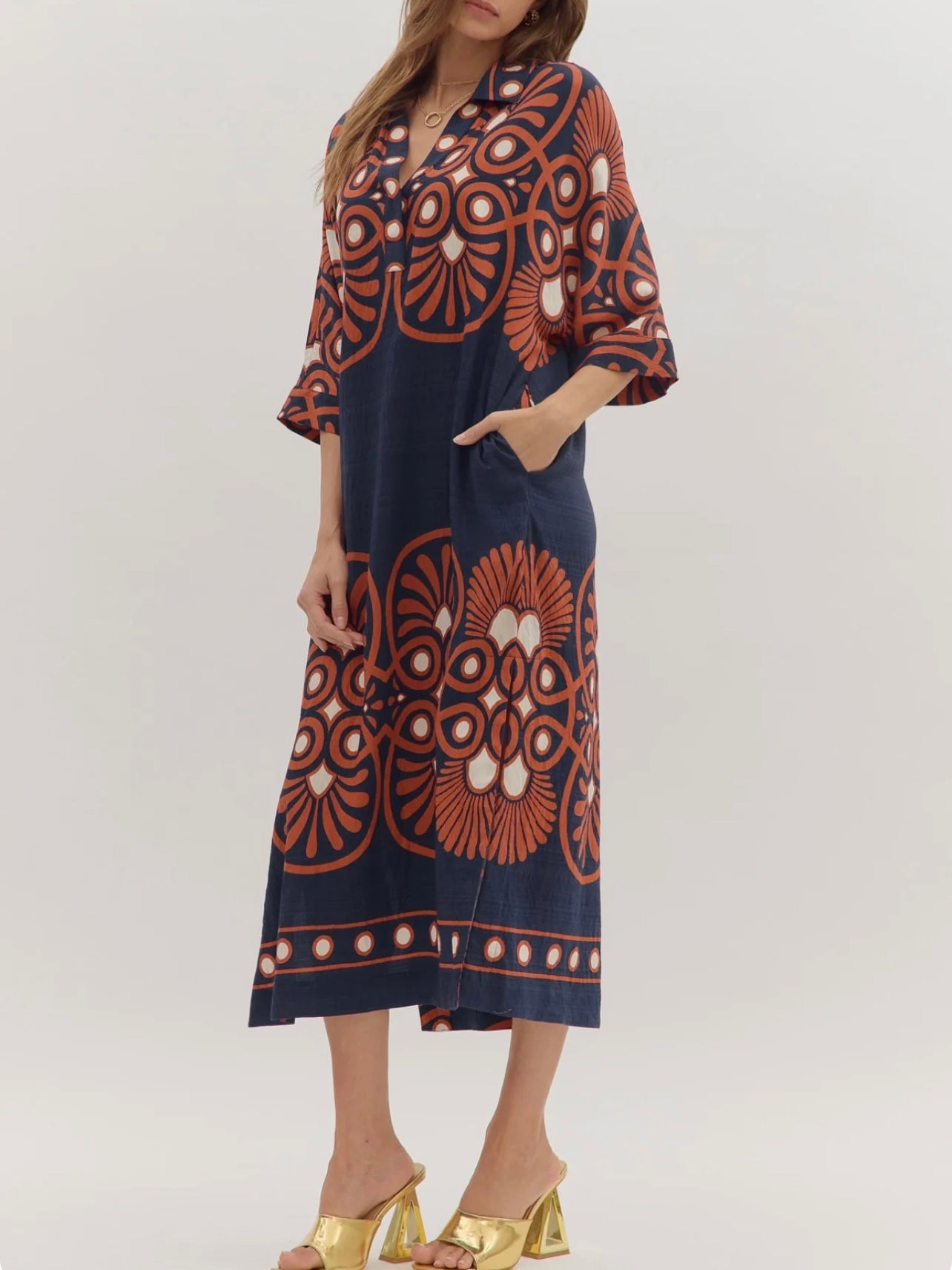 Easy fit and effortless navy geo print midi dress featuring notch collar and side pockets.