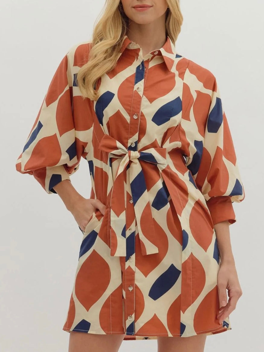 Retro print balloon sleeve minidress featuring front tie belt and side pockets.